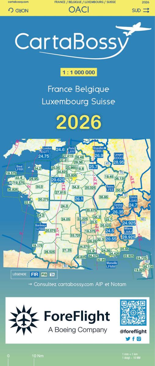 La carte Bossy VFR France 2026 inclut l'intégralité de la France, de la Suisse, de la Belgique et du Luxembourg.